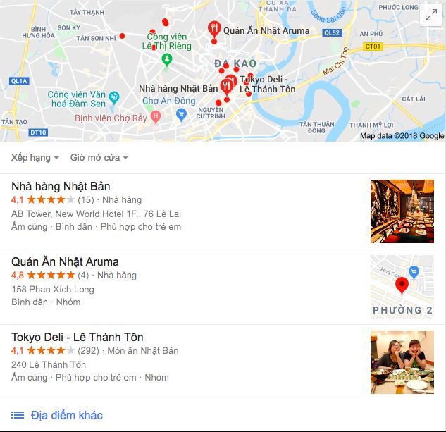 When users search through the above keywords, Google will combine with its Maps tool to find businesses that offer related products and services in a designated area. Not stopping there, Google will put businesses with the most positive reviews first, helping users to make purchasing decisions and use the best service.